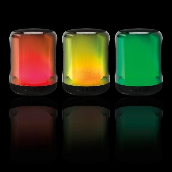 Bocina bluetooth recargable con luz RGB ajustable a 10 efectos diferentes. Reproducción de música 4 hrs aproximadamente. Rango de conexión 10 metros. Cuenta con puerto para tarjeta TF, puerto USB, puerto auxiliar 3.5 mm y puerto tipo C. Radio FM. Incluye cable cargador USB.