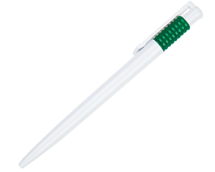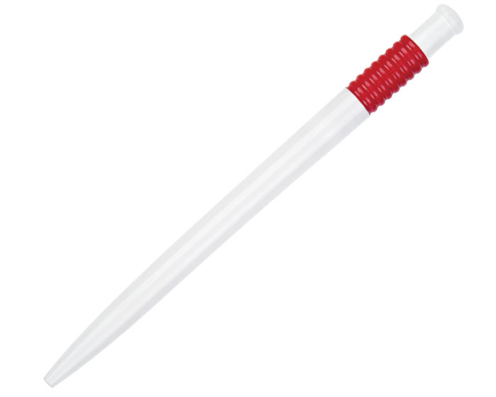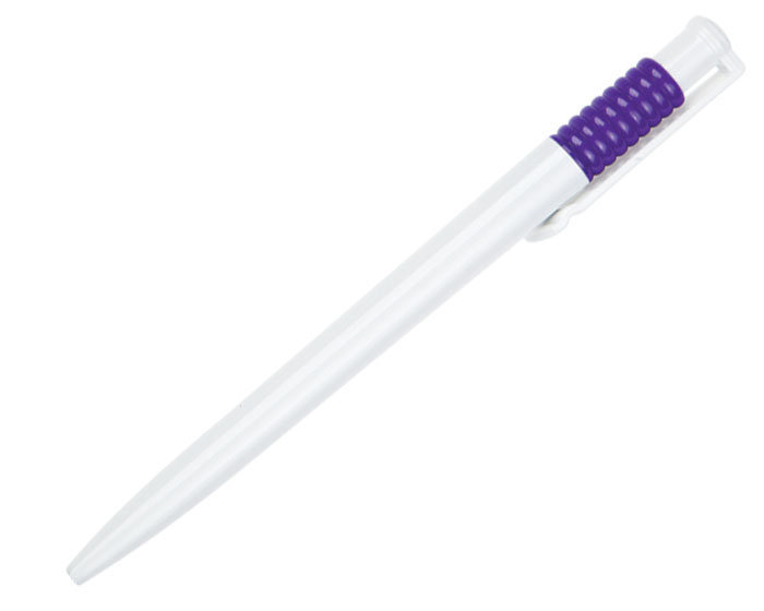 Bolígrafo de plástico, cuerpo blanco, detalle de anillo en color. Mecanismo de click.