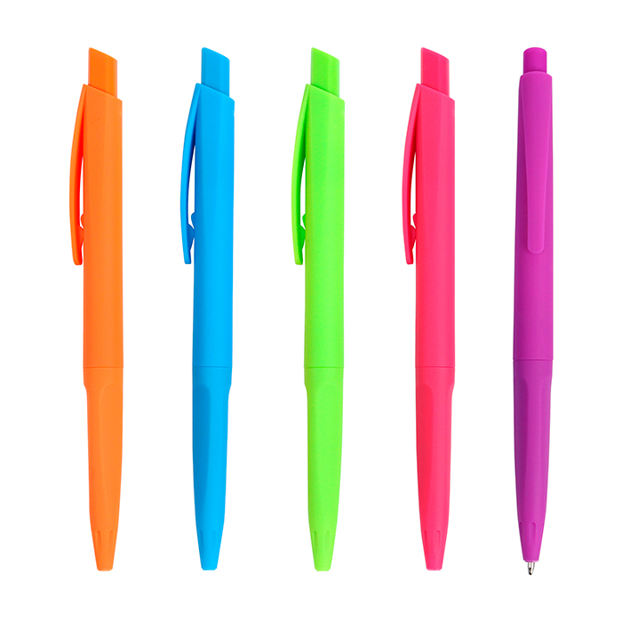 Bolígrafo fabricado en plástico con acabado rubber, que le brinda un tacto suave y agradable, y además proporciona un agarre antideslizante, lo que permite un control cómodo y preciso durante la escritura. Utiliza tinta de escritura azul.