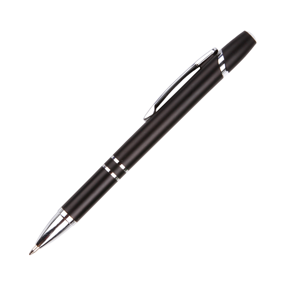 Bolígrafo retráctil fabricado en plástico ABS con barril en acabado metálico satinado, clip y punta cromados. Tinta de escritura negra.