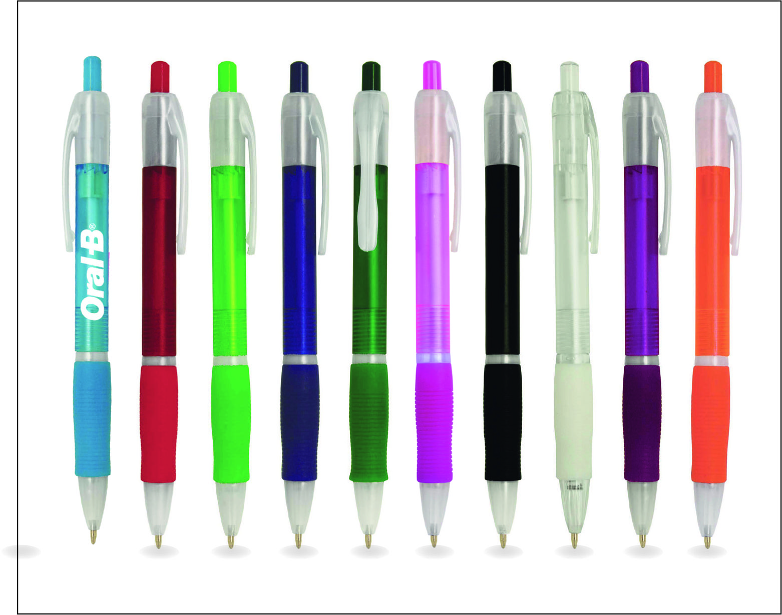 Bolígrafo de plástico con clip frozen y grip de goma.