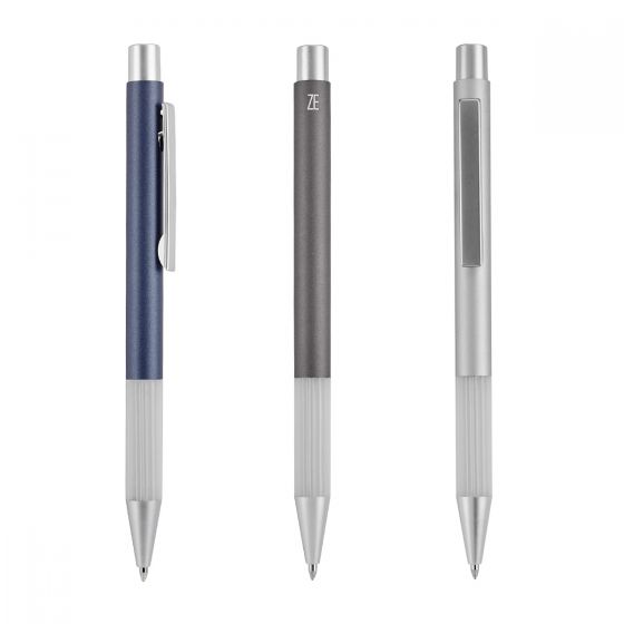 Bolígrafo con grip antiderrapante. Mecanismo pulsador. Incluye funda.