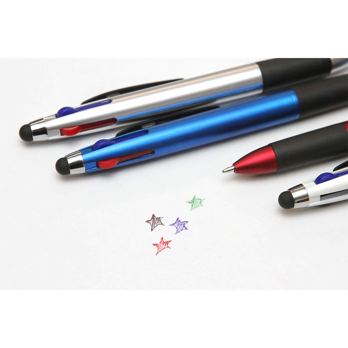 Bolígrafo 4 en 1, con barril de plástico ABS con terminado metalico, clip de plástico y touch en la parte superior. En la parte inferior trae una goma de silicona para mayor comodidad al momento de sujetarla, cuenta con 4 colores de escritura (azul, negro, rojo, verde).El bolígrafo 4 en 1 es una herramienta versátil y práctica que combina la funcionalidad de cuatro bolígrafos en un solo dispositivo, proporcionando una solución conveniente para múltiples necesidades de escritura.