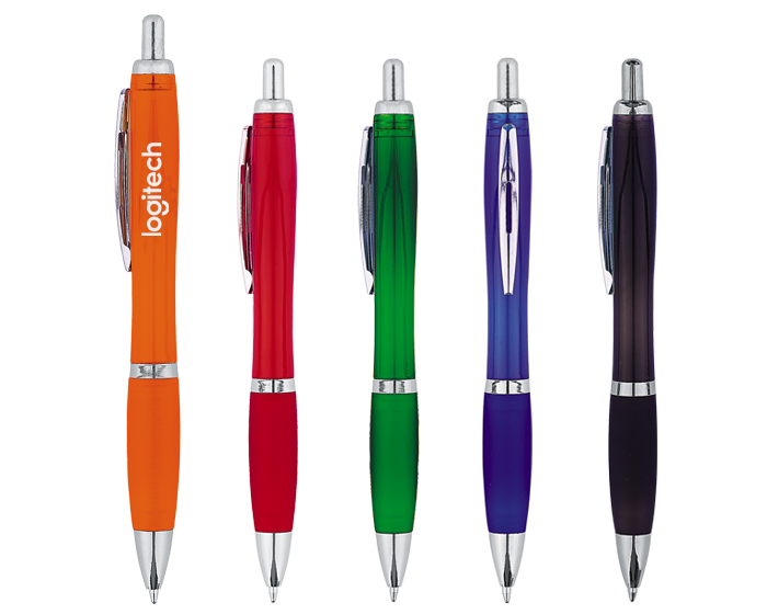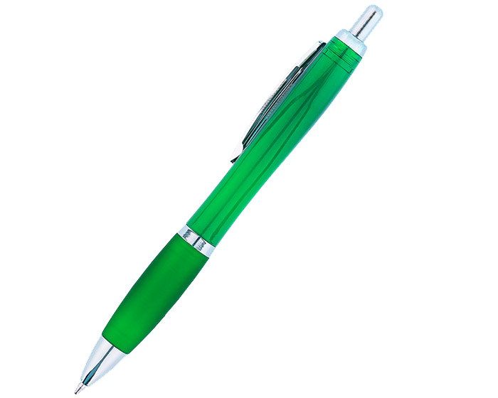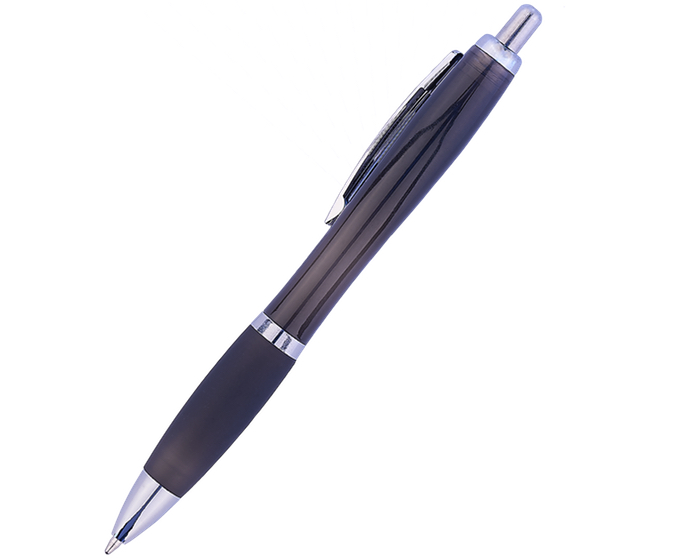 Bolígrafo de plástico con cuerpo traslúcido, clip metálico y goma antideslizante. Mecanismo de click.