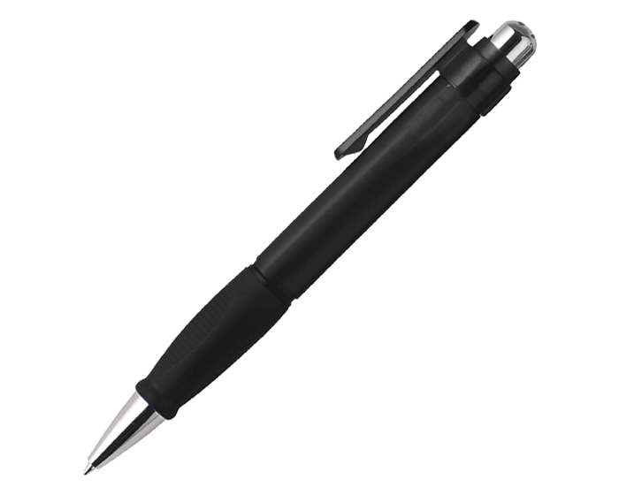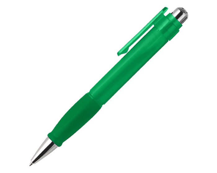 Bolígrafo de plástico en colores traslúcidos, con goma antideslizante y punta cromada. Mecanismo de click.