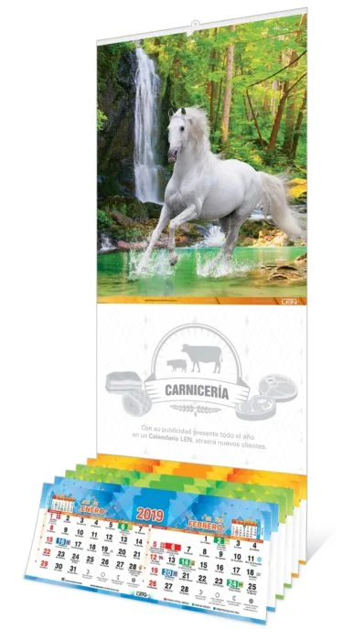 Descripción: Calendario de pared con santoral de 6 hojas, cromo impreso en selección de color, barniz UV, con varilla metálica y ojillo para colgar.