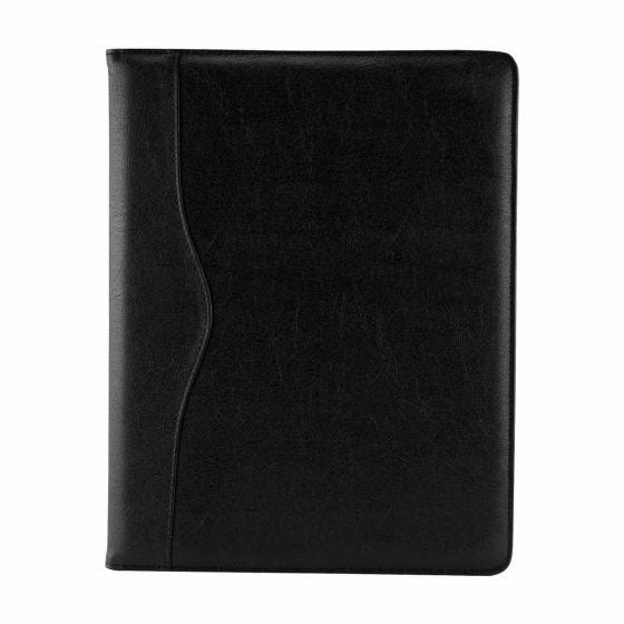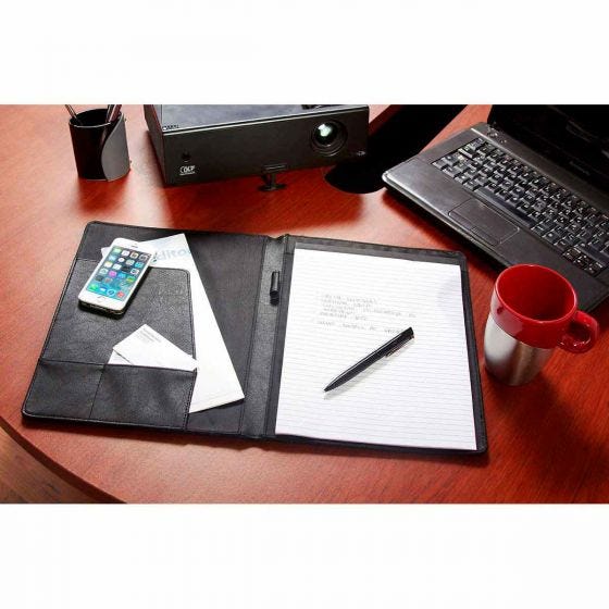 Incluye block de raya tamaño A4 con 20 hojas, elástico para bolígrafo, compartimento para documentos y tarjetas, asas, soporte y base para tablet y mini tablet. No incluye bolígrafo.