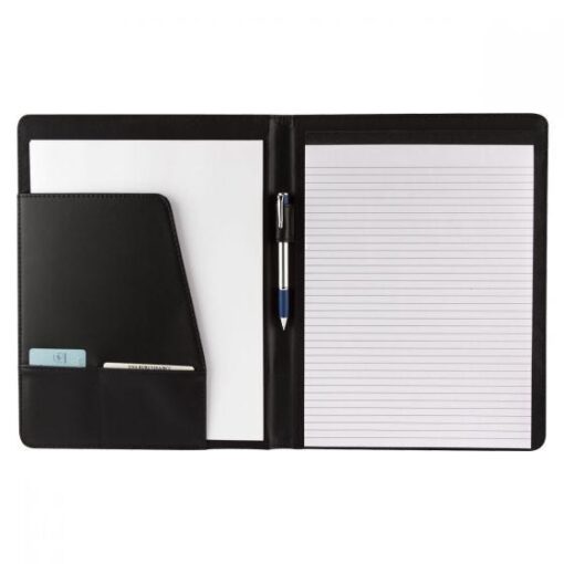 Incluye block de raya tamaño A4 con 20 hojas, compartimento para bolígrafo, documentos y tarjetas. No incluye bolígrafo.