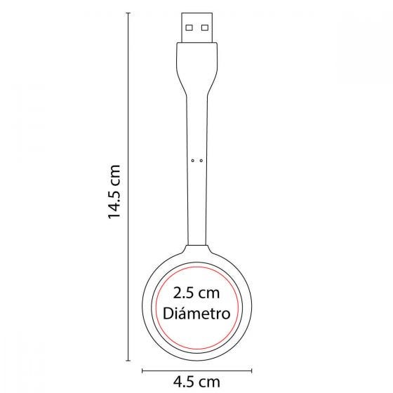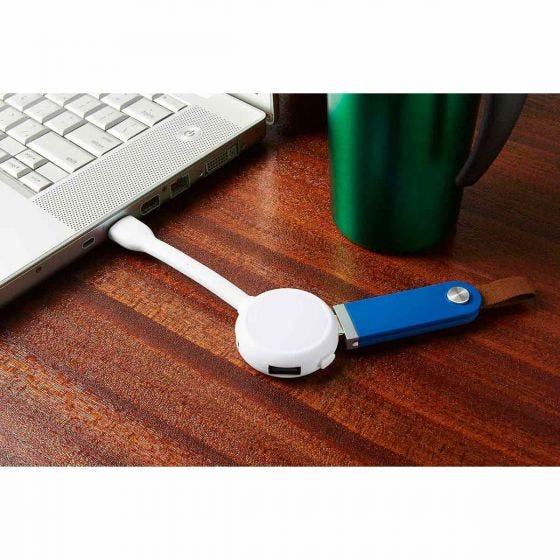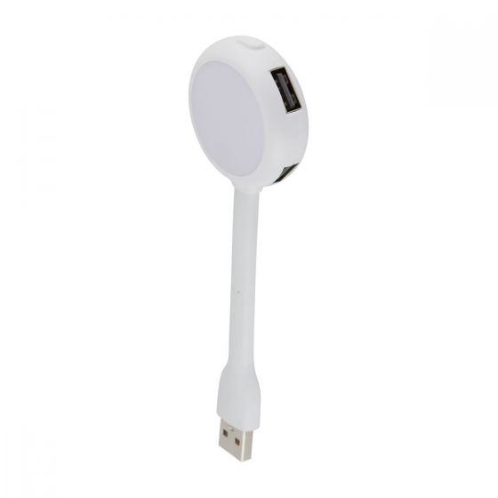 Concentrador con 4 puertos USB 2.0 y luz LED. Incluye botón para encender y apagar la lámpara. Cuerpo flexible. No requiere baterías.