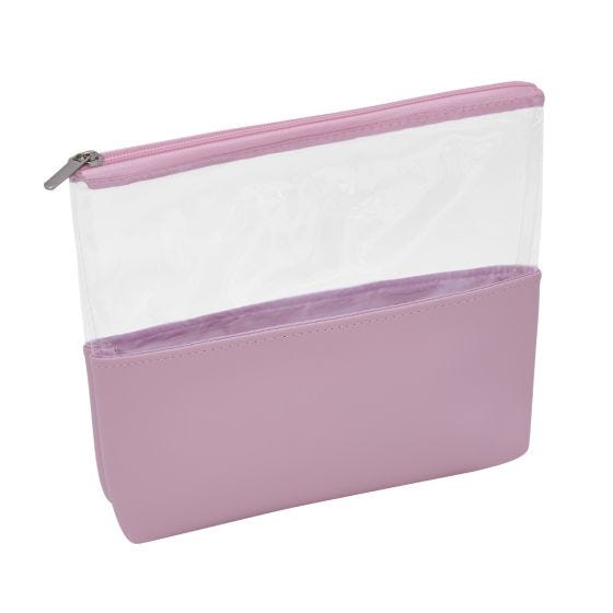 Cosmetiquera con cierre. Diseño combinado de PVC transparente y curpiel de color en base.