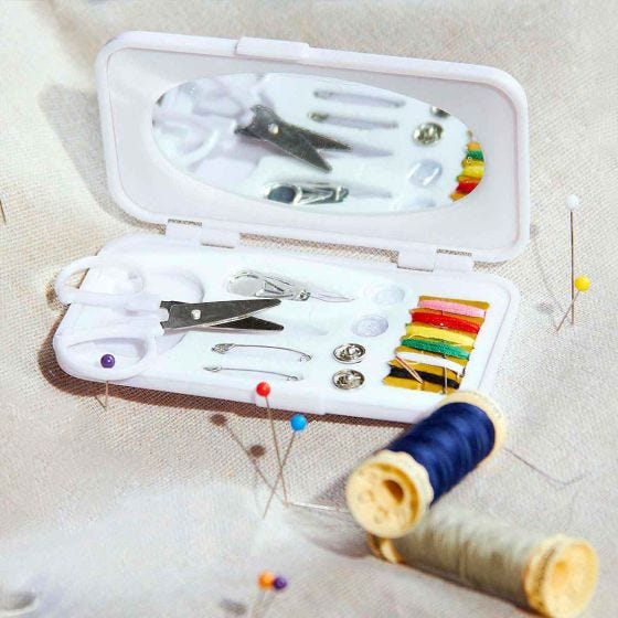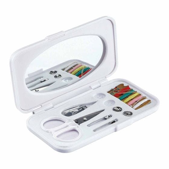 Incluye botones, ensartador de aguja, tijeras, hilo, agujas, seguros y estuche con espejo.