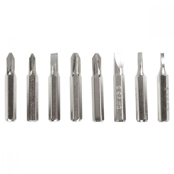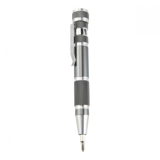 Desarmador de bolsillo con 4 puntas de cruz y 4 puntas planas diferentes e intercambiables. Incluye clip.