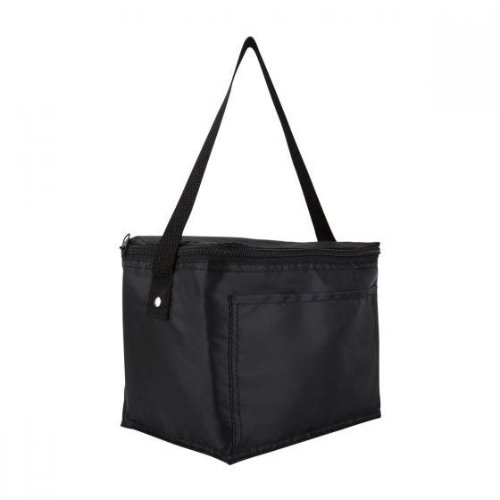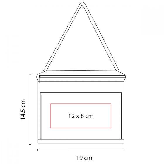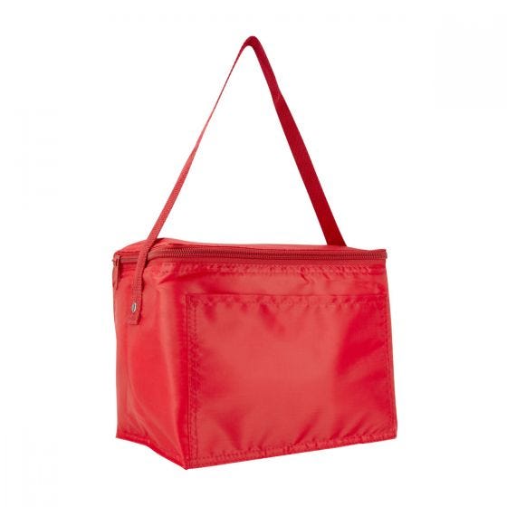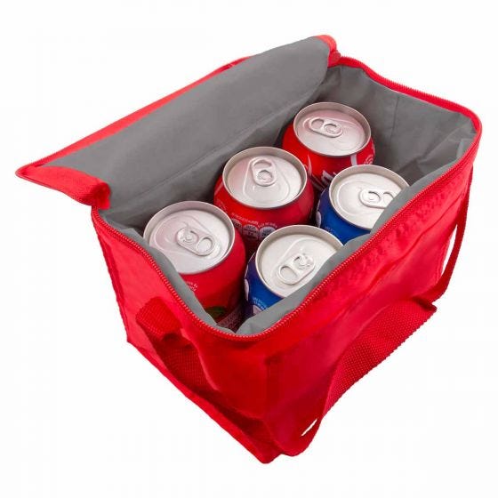 Interior plastificado impermeable. Bolsa principal con cierre y bolsa frontal. Incluye correa ajustable. Capacidad para 6 latas.
