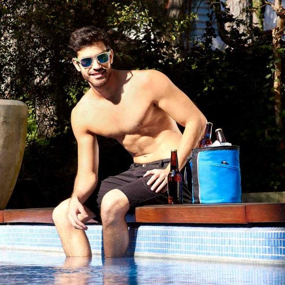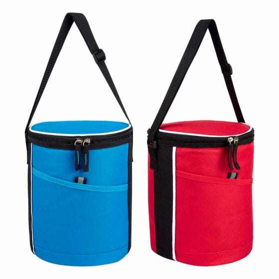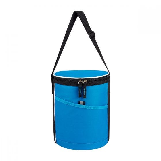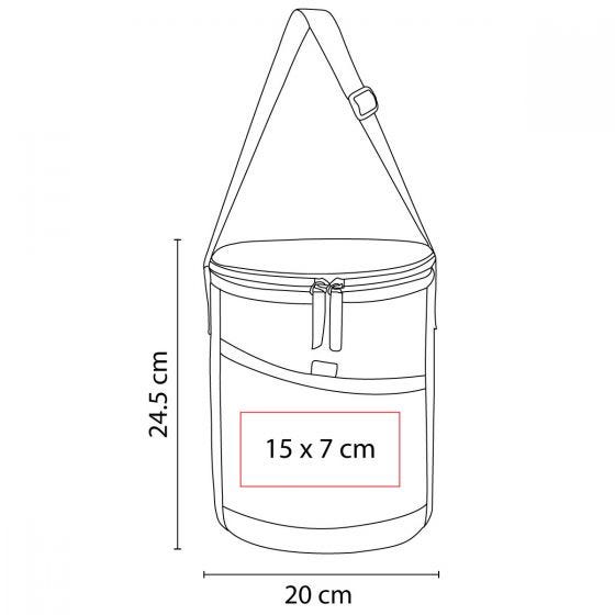 Interior plastificado impermeable. Bolsa principal con cierre y bolsa frontal. Incluye correa ajustable. Capacidad para 6 latas.