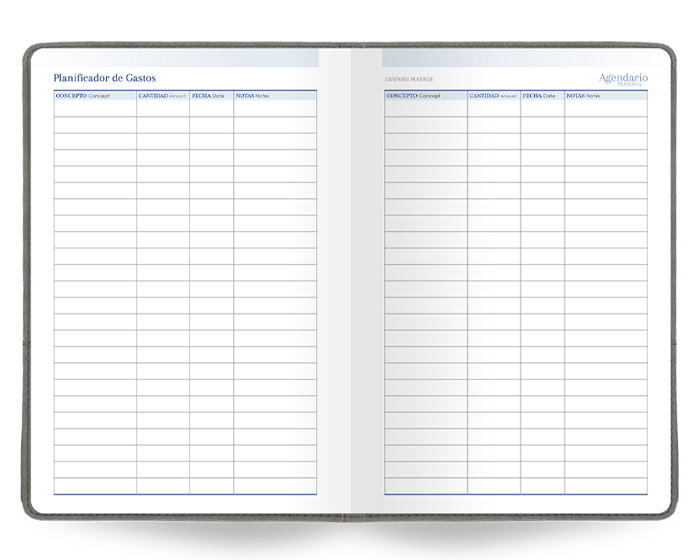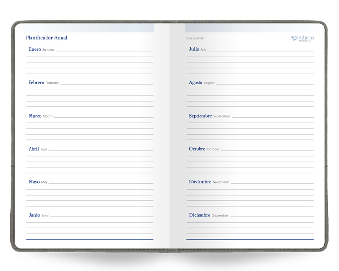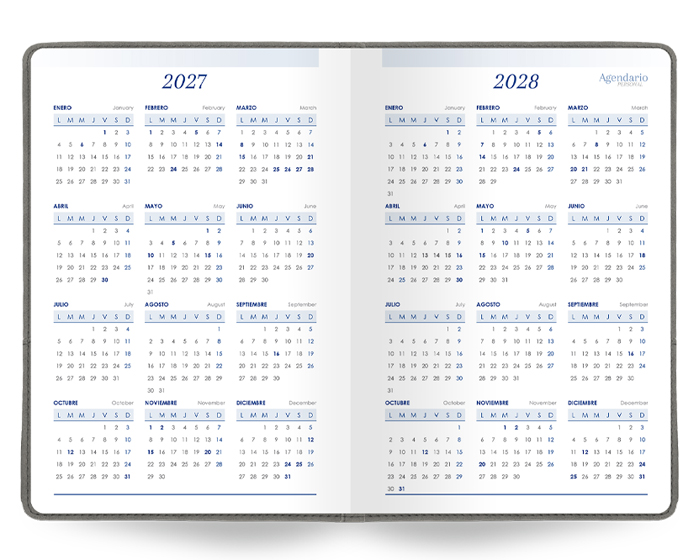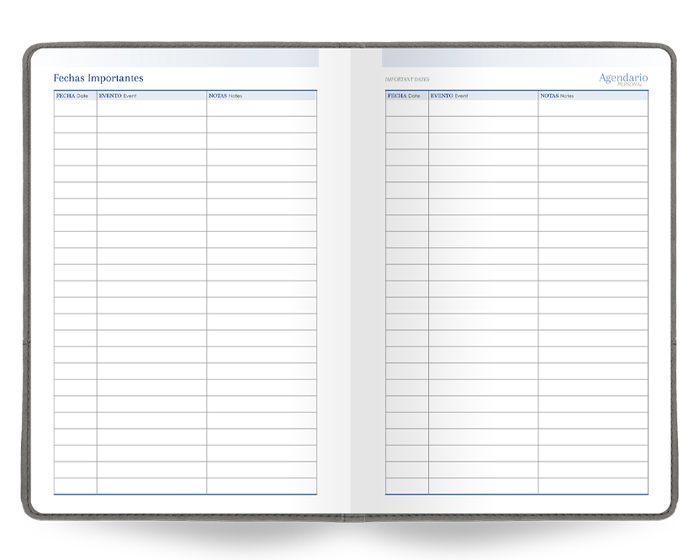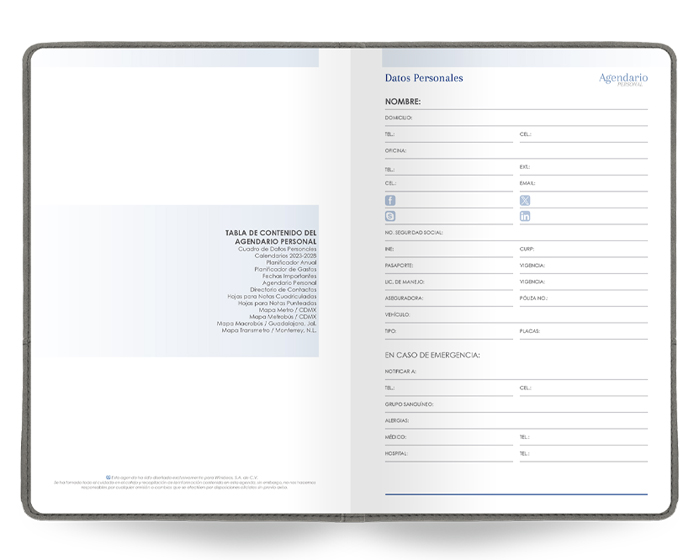 Agendario Premium de 168 hojas. Incluye: Cuadro de Datos Personales, Calendarios 2023-2028, Planificador Anual, Planificador de Gastos, Fechas Importantes, Agendario Personal, Directorio de Contactos, Hojas para Notas Cuadriculadas, Hojas para Notas Punteadas, Mapa Metro / CDMX, Mapa Metrobús / CDMX, Mapa Macrobús / Guadalajara, Jal., Mapa Transmetro / Monterrey, N.L. Diseño de portada con dos compartimentos en el exterior, uno para bolígrafo (no incluido) y el otro para celular. Se vende por separado la caja A2956.