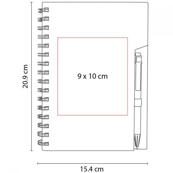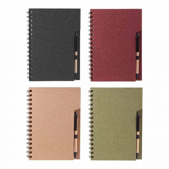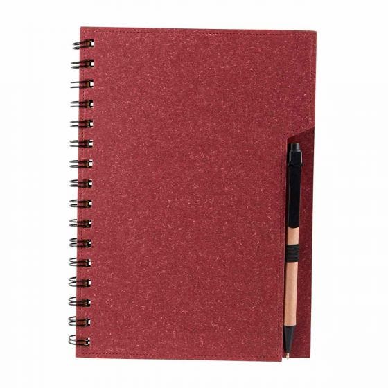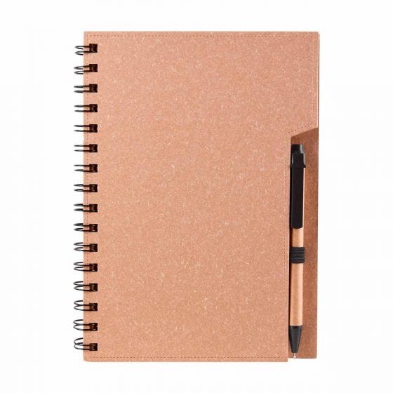 Libreta con 70 hojas de raya. Incluye bolígrafo ecológico y espiral metálico doble.
