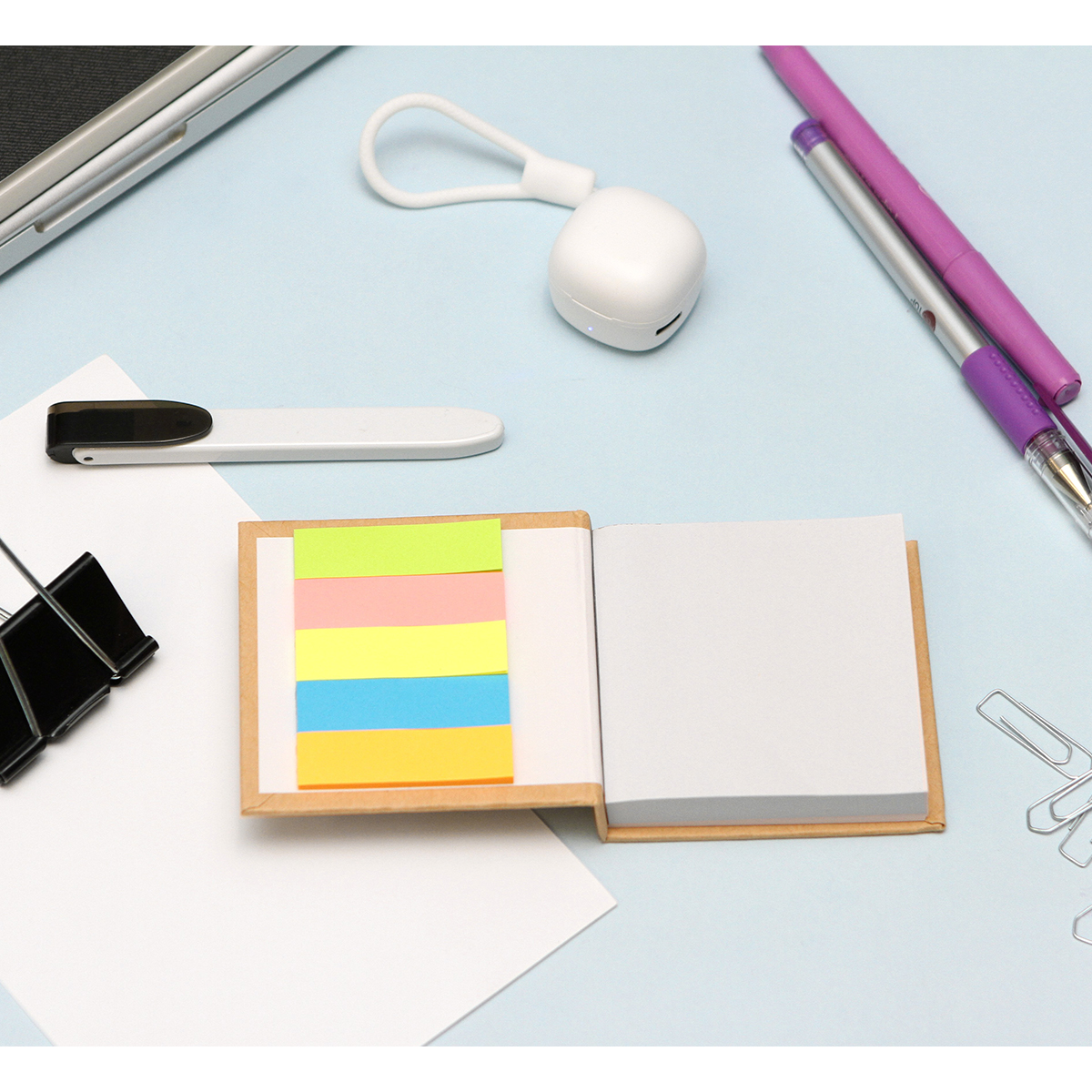 Libreta ecológica de pasta rígida con notas de color blanco y banderitas de colores adhesivas. Es una opción ideal para aquellos que buscan una libreta funcional y ecológica.