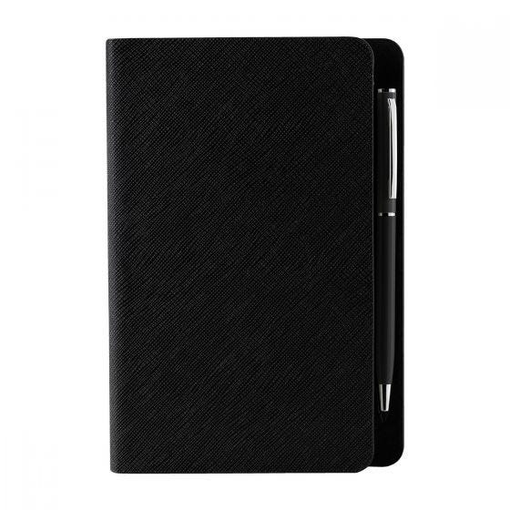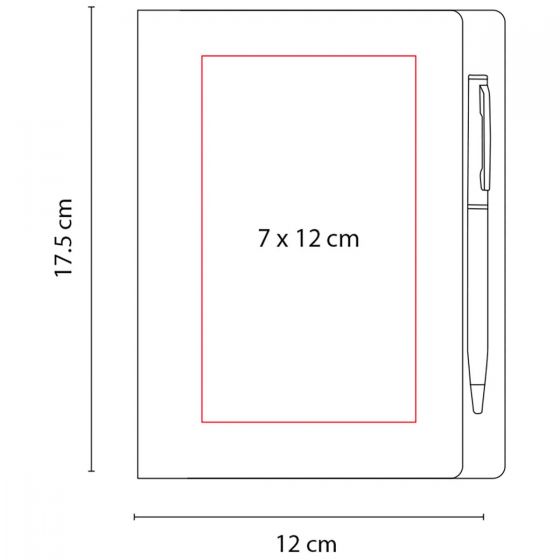 Libreta con 80 hojas de raya. Contracubierta con espacio imantado para bolígrafo. Incluye bolígrafo metálico.