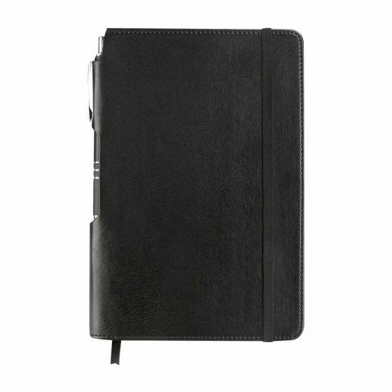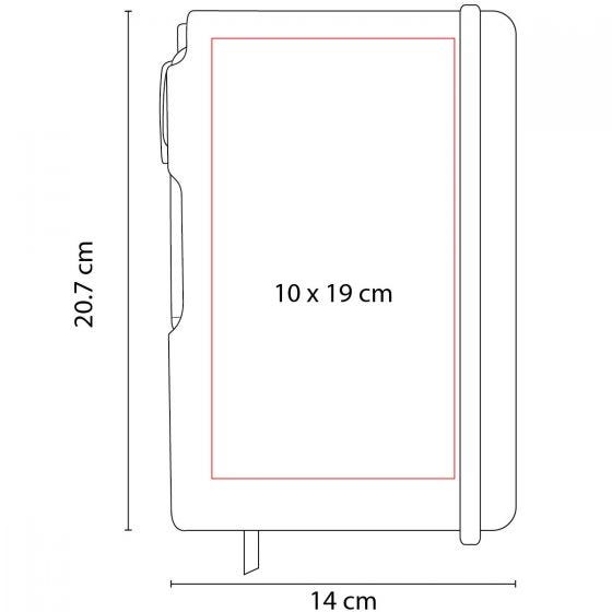 Libreta con 80 hojas de raya. Incluye separador de hojas, elástico para cerrar y bolígrafo de plástico.