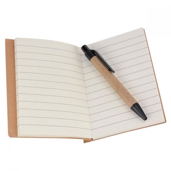 Libreta con 80 hojas de raya. Incluye bolígrafo ecológico.