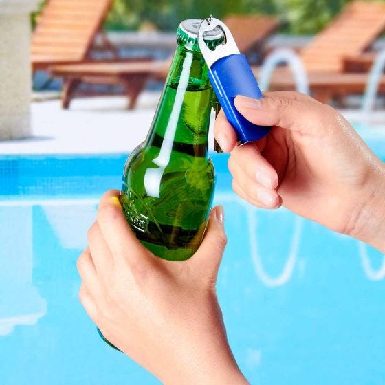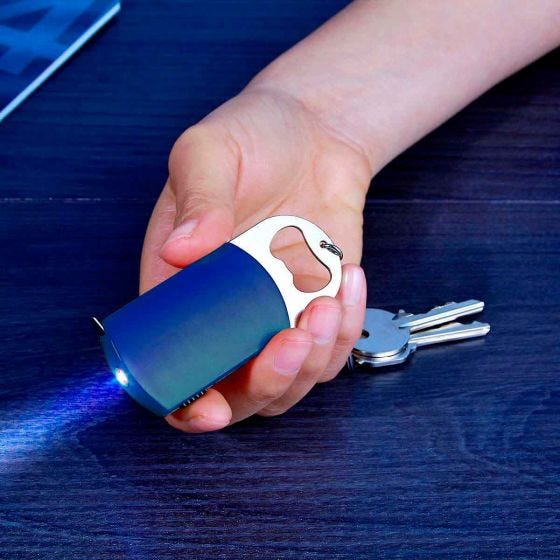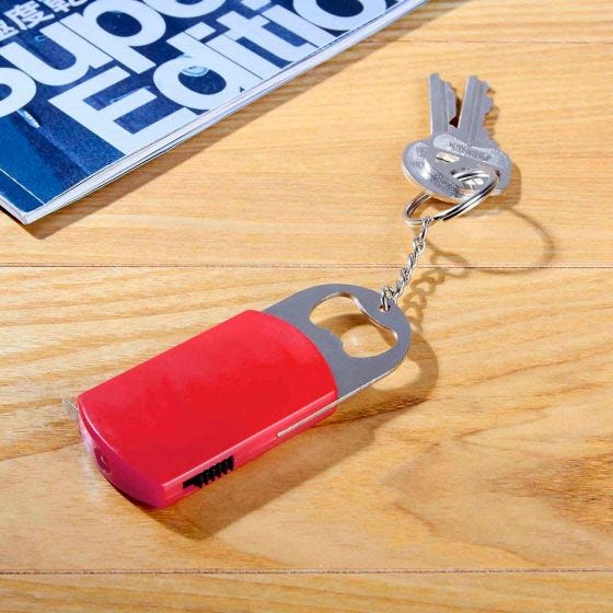 Llavero destapador con lámpara de 1 LED y flexómetro de cinta metálica de 1 m.