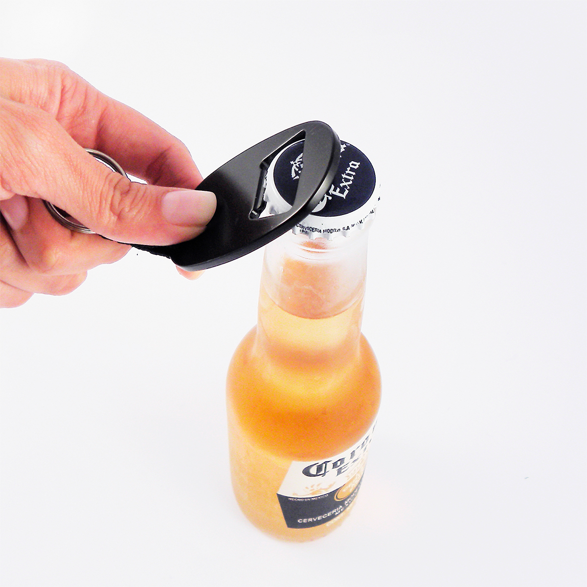Llavero metálico con detalle de tela, es un accesorio multifuncional y práctico que combina la utilidad de un llavero con la funcionalidad de un destapador.