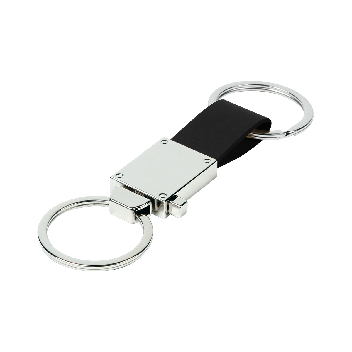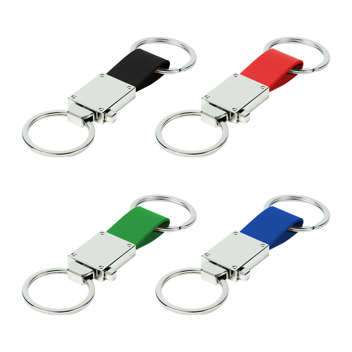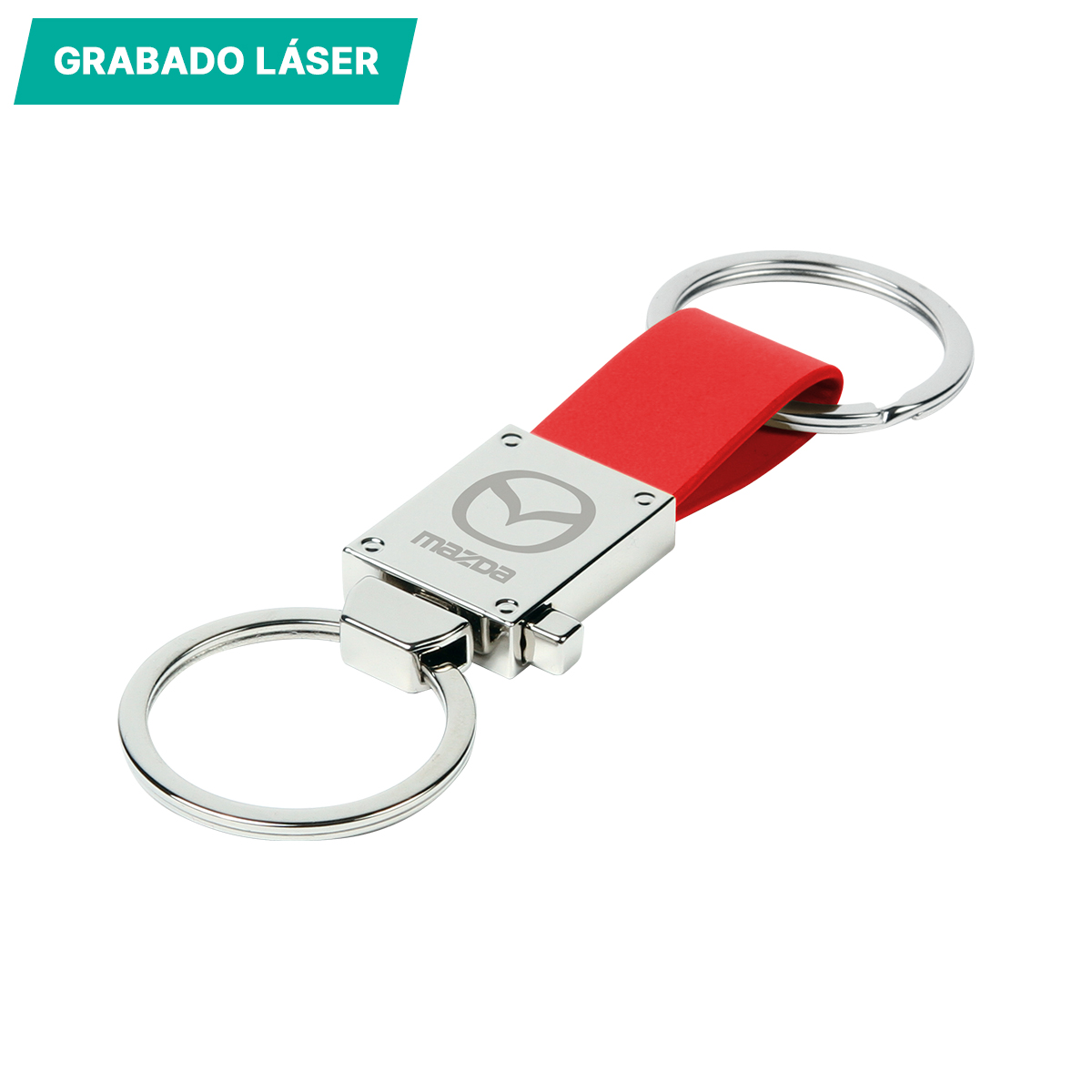 Llavero fabricado en aleación de zinc con correa de curpiel y argolla desprendible.