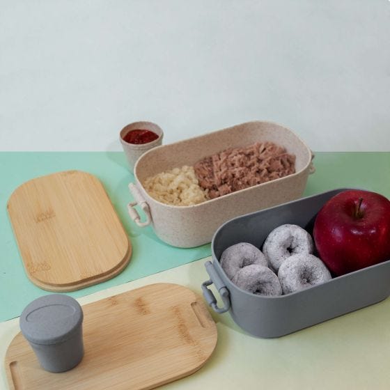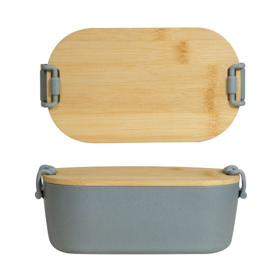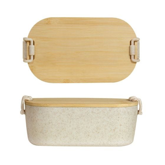 Lonchera de plástico con un toque natural y elegante, su tapa de bambú se asegura con dos broches de plástico, para mantener la lonchera cerrada. En su interior, cuenta con un práctico tenedor y un pequeño contenedor destinado para salsas, aderezos o especias. Esta lonchera no solo ofrece un diseño atractivo, sino también, la versatilidad necesaria para llevar tus alimentos de manera organizada.