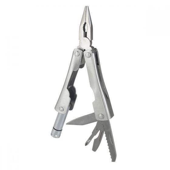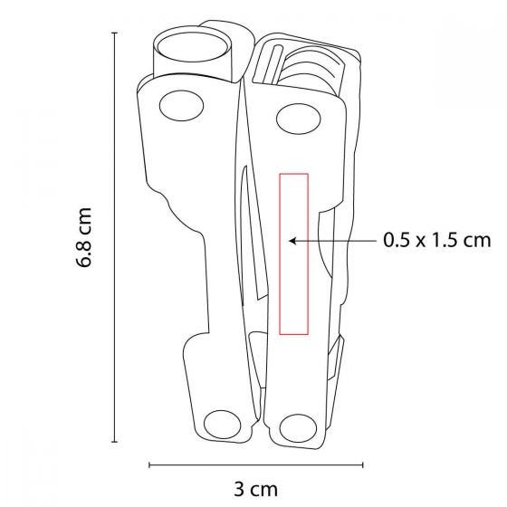 Mini pinzas con 7 funciones. Cuenta con lámpara de 1 LED, navaja, desarmador de cruz, serrucho, destapador con punta de desarmador plano. Incluye funda y 3 baterías de botón.