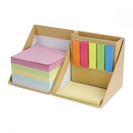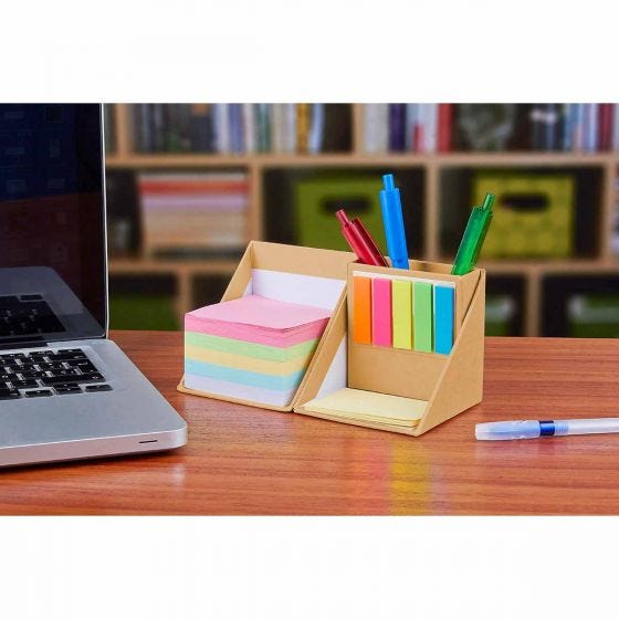 Incluye porta plumas, 500 notas de diferentes colores, 25 notas adheribles amarillas y 5 banderas adheribles de diferentes de colores.