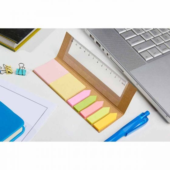 Incluye notas adheribles: 25 amarillas, 25 rosas y banderillas de 5 colores. Regla de 12 cm en la cubierta.