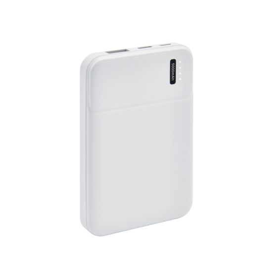 Batería auxiliar para smartphone, capacidad 5,000 mAh. Contiene 1 puerto de salida USB para carga de dispositivos y 2 puertos de entrada: 1 tipo C y 1 micro USB para carga de la batería. Incluye 4 LEDs indicadores de carga y cable micro USB.