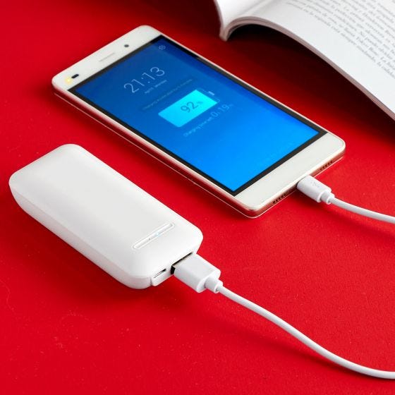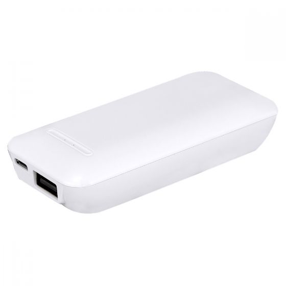 Batería auxiliar para smartphone, capacidad 2,400 mAh. Incluye cable cargador compatible con USB y micro USB.