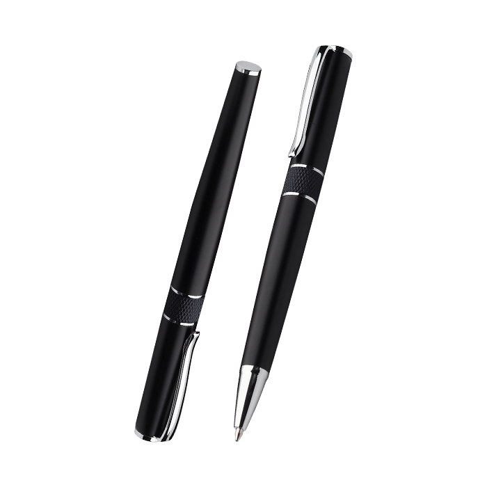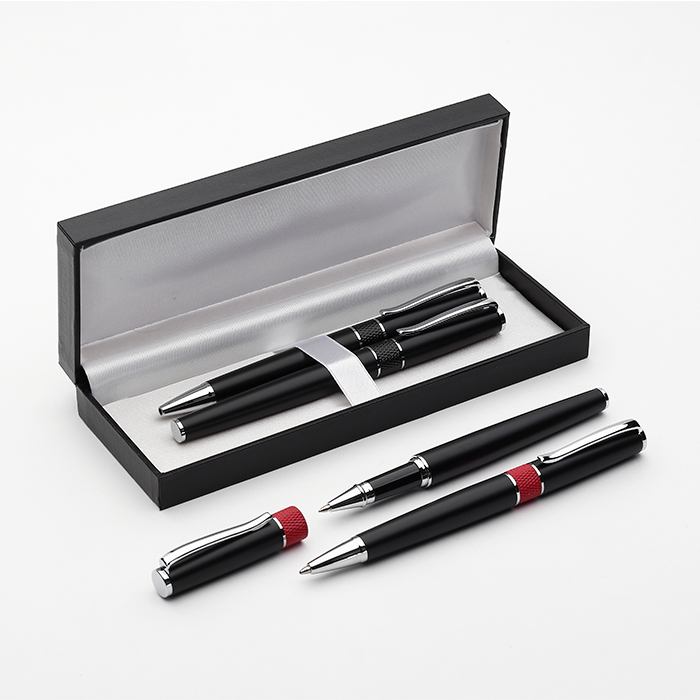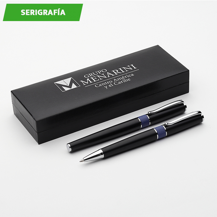 Set de bolígrafos ball pen y roller pen con barril metálico en estuche de cartón, tinta de escritura negra.