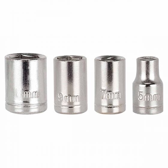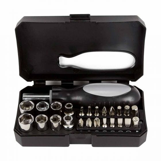 Contiene desarmador y 10 puntas diferentes e intercambiables, 5 llaves hexagonales, dado extensión, 4 dados y pinzas de punta. Incluye estuche.
