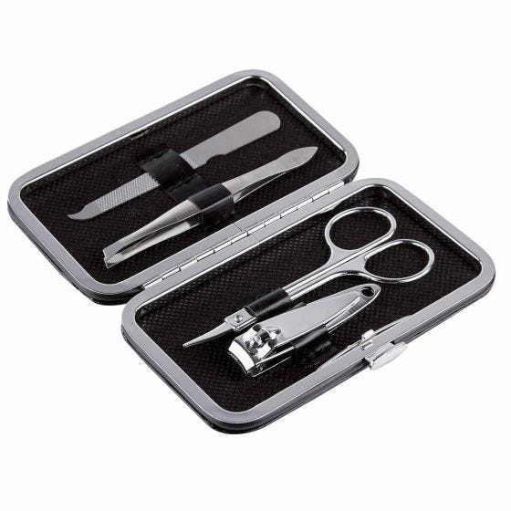 Set con 1 tijeras, 1 pinza para cejas, 1 cortauñas, 1 lima de uñas, 1 empujador de cutícula, 1 brocha de rubor, 1 aplicador de sombra, 3 brochas para sombra y estuche con espejo. Los accesorios de manicure no son para uso profesional.