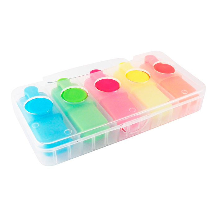 Juego de 5 marca textos de colores vibrantes en estuche de plástico transparente. Es perfecto para subrayar, colorear y rotular sobre papel, brindándote una forma fácil y eficaz de resaltar información relevante en tus documentos. Diseño portátil y colores llamativos.
