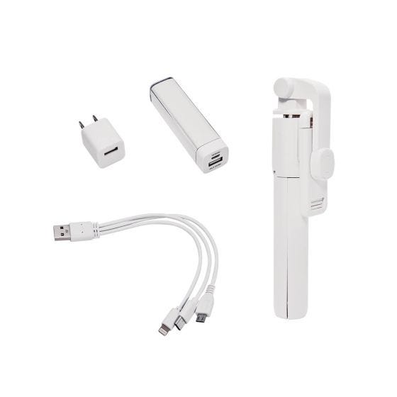 Incluye selfie stick inalámbrico con bluetooth y control remoto para accionar la cámara a distancia. Batería auxiliar de 2,200 mAh, cargador de pared, cable cargador USB 3 en 1 (micro USB, tipo C y lightning) y estuche.