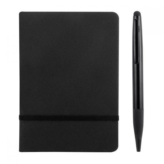 Set que incluye libreta con 80 hojas de raya, separador de hojas y elástico para cerrar, bolígrafo y caja de regalo.