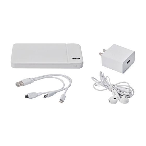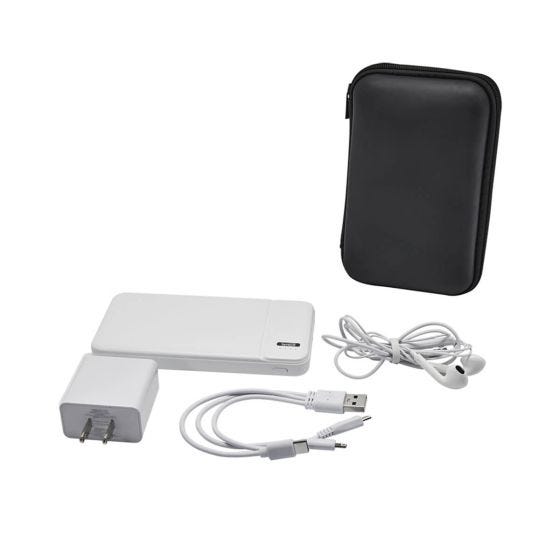 Incluye batería auxiliar para smartphone de 8,000 mAh con 2 puertos de carga micro USB y tipo C, 2 puertos USB y 4 LEDs para indicar nivel de carga, cargador de pared con entrada USB, audífonos con control de volumen y función play/pausa, cable cargador USB con entradas micro USB, tipo C y lightning. Incluye estuche con cierre.