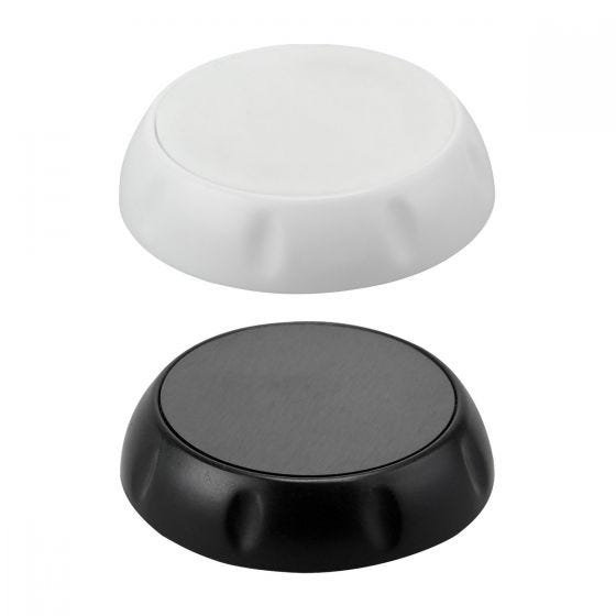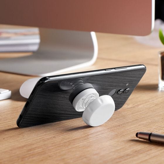 Soporte desplegable con adhesivo al reverso para pegarse al smartphone.