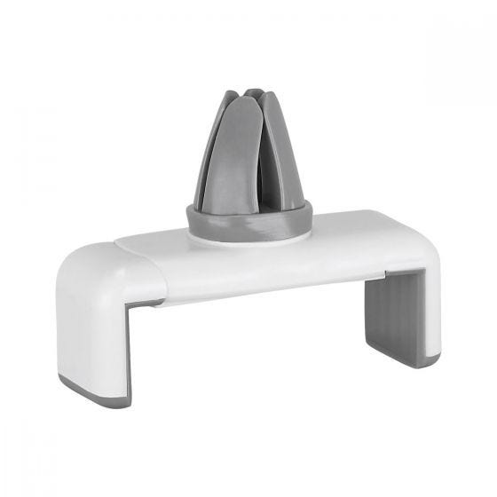 Soporte con mecanismo ajustable para smartphones de 6 a 8 cm de ancho. Ángulo de rotación de 360°. Se monta en las ventilas del aire acondicionado.