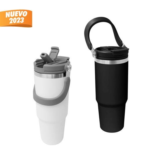 Doble pared. Pared interna y externa de acero inoxidable. Cerrado al vacío. Tapa con asa plegable de plástico con cierre de rosca. Sobretapa de push y popote retractil. Mantiene temperatura caliente 6 hrs y temperatura fría 8 hrs aproximadamente. Incluye caja individual.