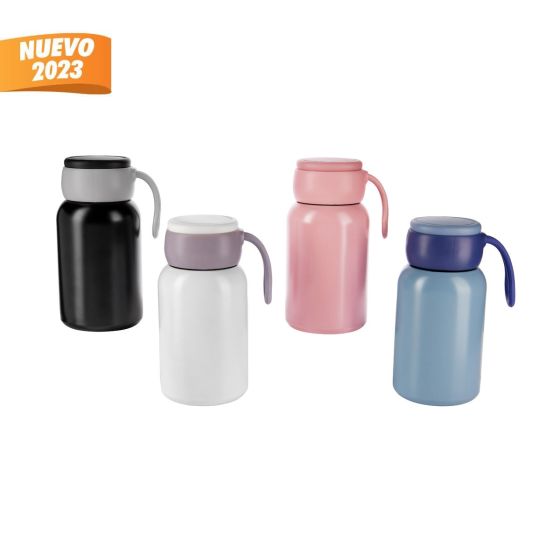 Doble pared. Cerrado al vacío. Pared interna y externa de acero inoxidable. Tapa de plástico bitono con sistema de rosca y asa de silicón. Mantiene temperatura caliente 6 hrs y temperatura fría 8 hrs aproximadamente. Incluye caja individual.