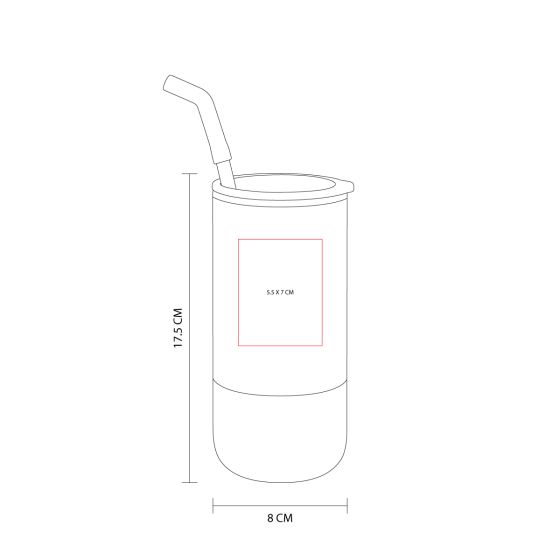 Doble pared. Pared interna plástico, pared externa acero inoxidable. Tapa de plástico con válvula de seguridad y popote metálico con boquilla removible de rubber. Incluye caja individual.
