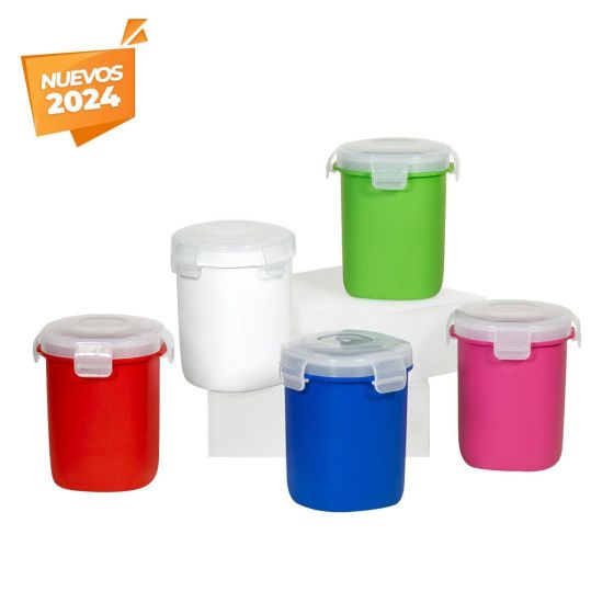 Vasito contenedor de plástico con tapa con cuatro pestañas y sello hermético para evitar derrames. Compacto y versátil, es perfecto para llevar tus snacks sin preocupaciones.